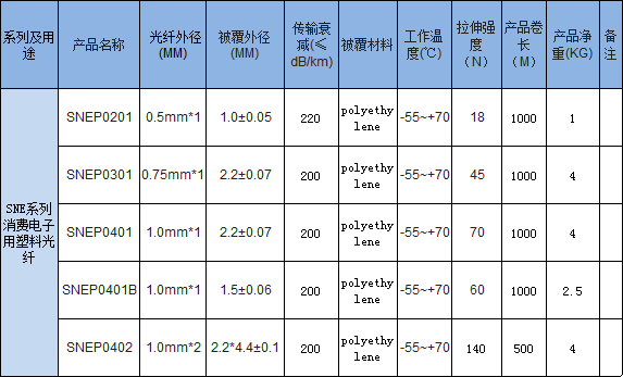 SNE系列消费电子用塑料光纤规格表: