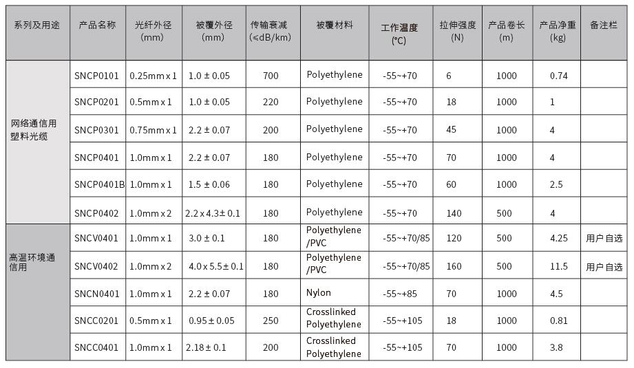 目前,在塑料光纤交换机、室内路由器、语音网关、PCIE网卡、USB适配器、光电介质转换器、墙面信息盒、有源中继器、无源耦合器、光电配线设备以及嵌入塑料光纤模块的网络监控、门禁等设备所构成的应用系统中,SNC系列通信与网络用塑料光缆是最重要的数据传输介质。